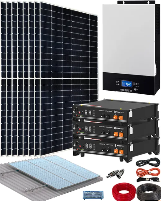 - Contenido del kit: 8 Paneles de 500W, Inversor de aislada 5000W a 48V premontado, 3 baterías de litio de 2.4kWh, 3 brackets para las baterías, Estructura coplanar para 8 paneles, 10m de cable negro y 10m de cable rojo de 6mm, 10m de cable negro y 10m de cable rojo de 10mm, Caja conectores fotovoltaicos, caja estanca y repartidor